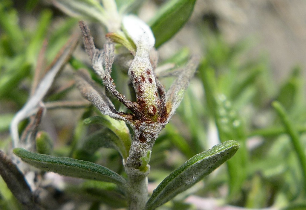 Bemerkung: Dieser Rostpilz vollführt keinen Wirtswechsel. Er verkürzt seinen Entwicklungszyklus und bildet nur Telien auf Berg-Gamander (Teucrium montanum) aus.
