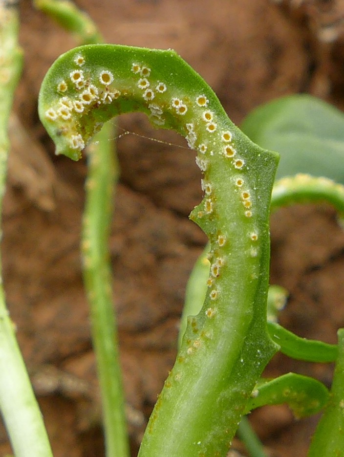 Uredien auf beiden Blattseiten, klein, zimtbraun, meist zerstreut, früh nackt (=stäubend)