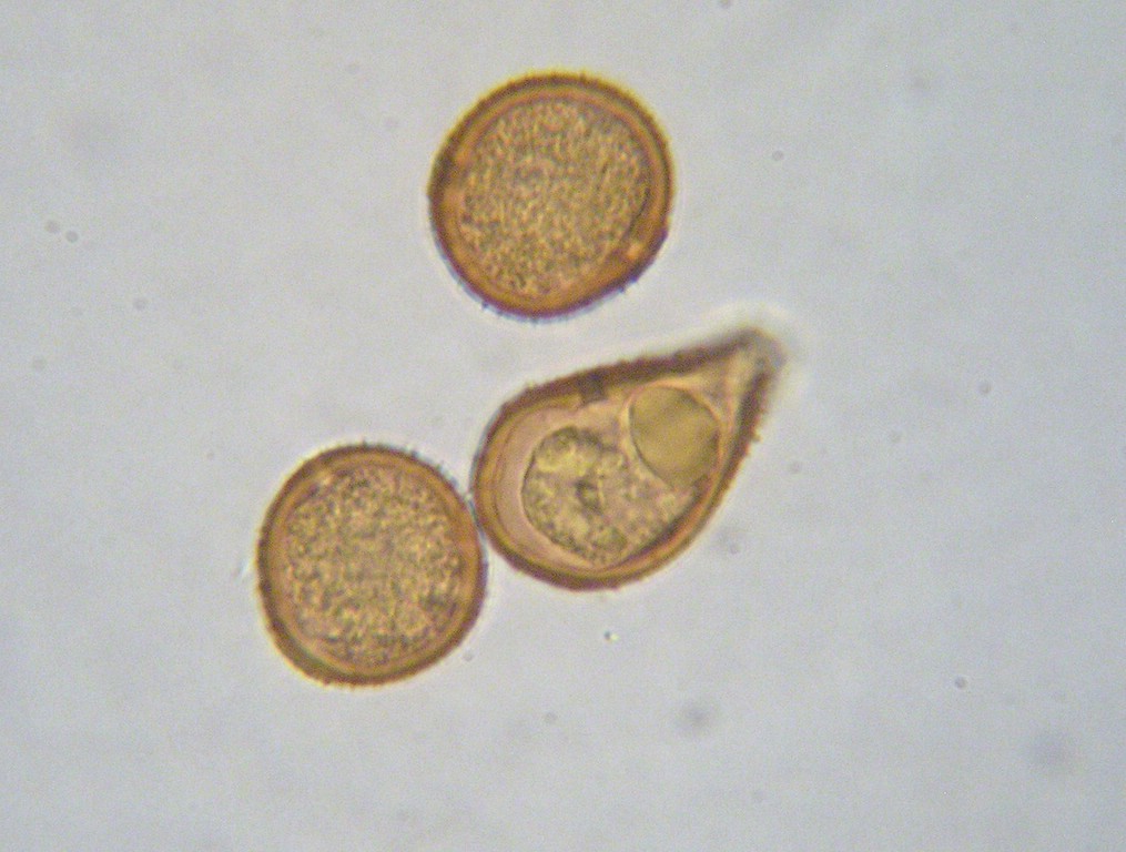 OLYMPUS DIGITAL CAMERAWand blassbraun, fein bestachelt (rechts im Bild eine deformierte Uredospore)