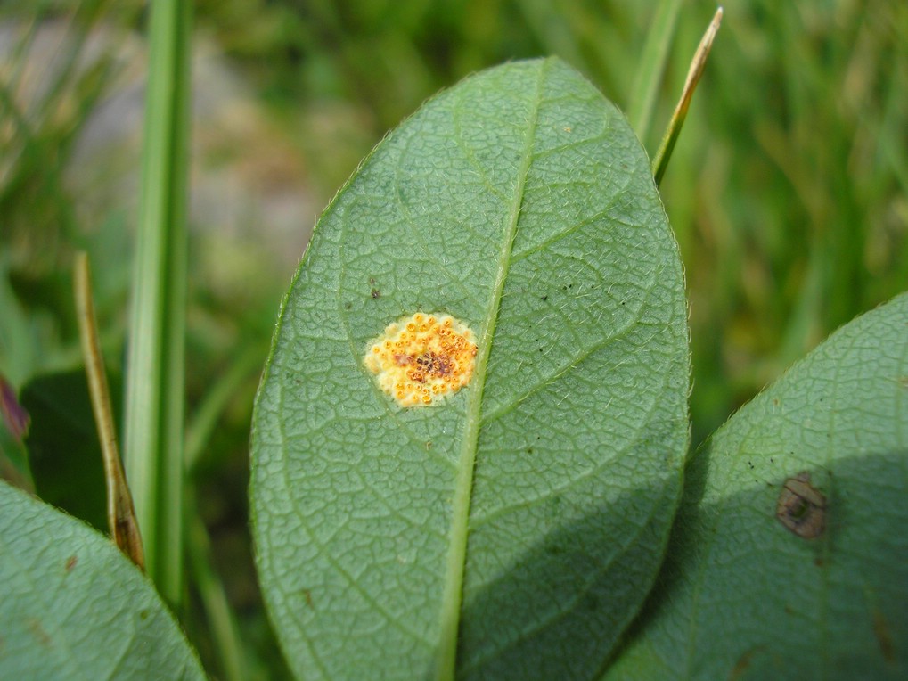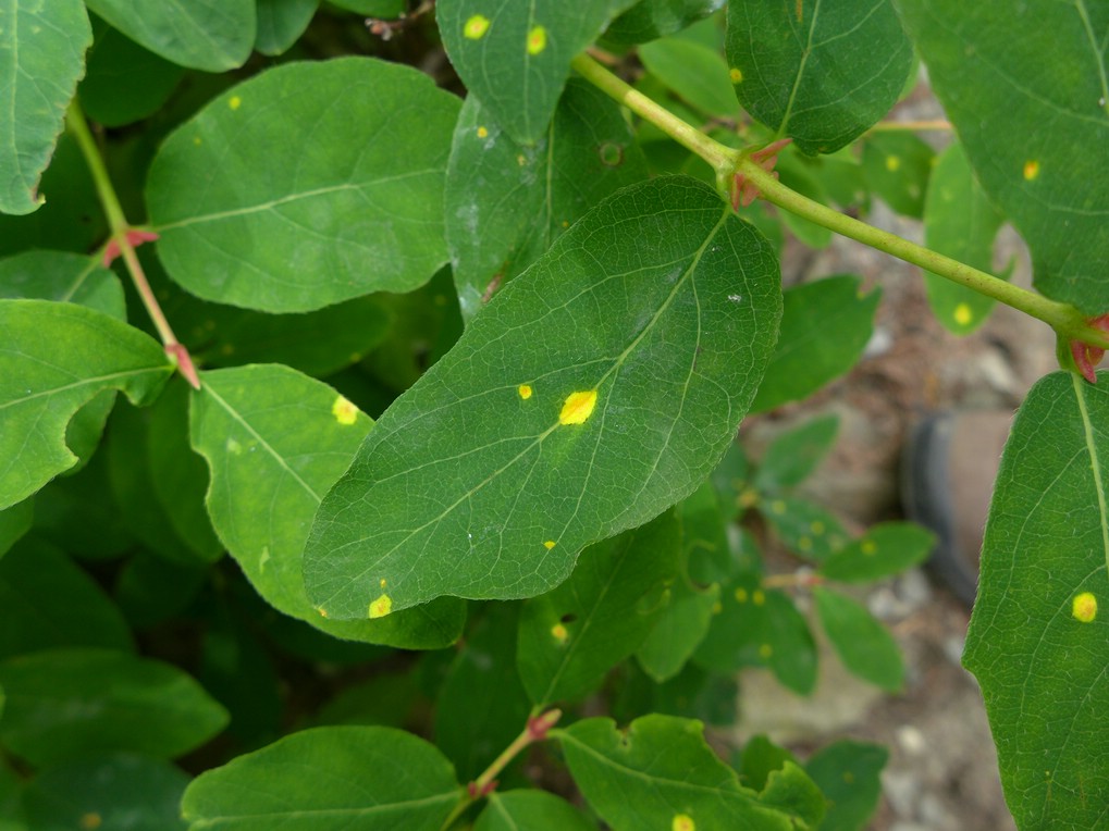 Spermogonien punktförmig, mittig blattoberseits der gelblichen Blattflecken