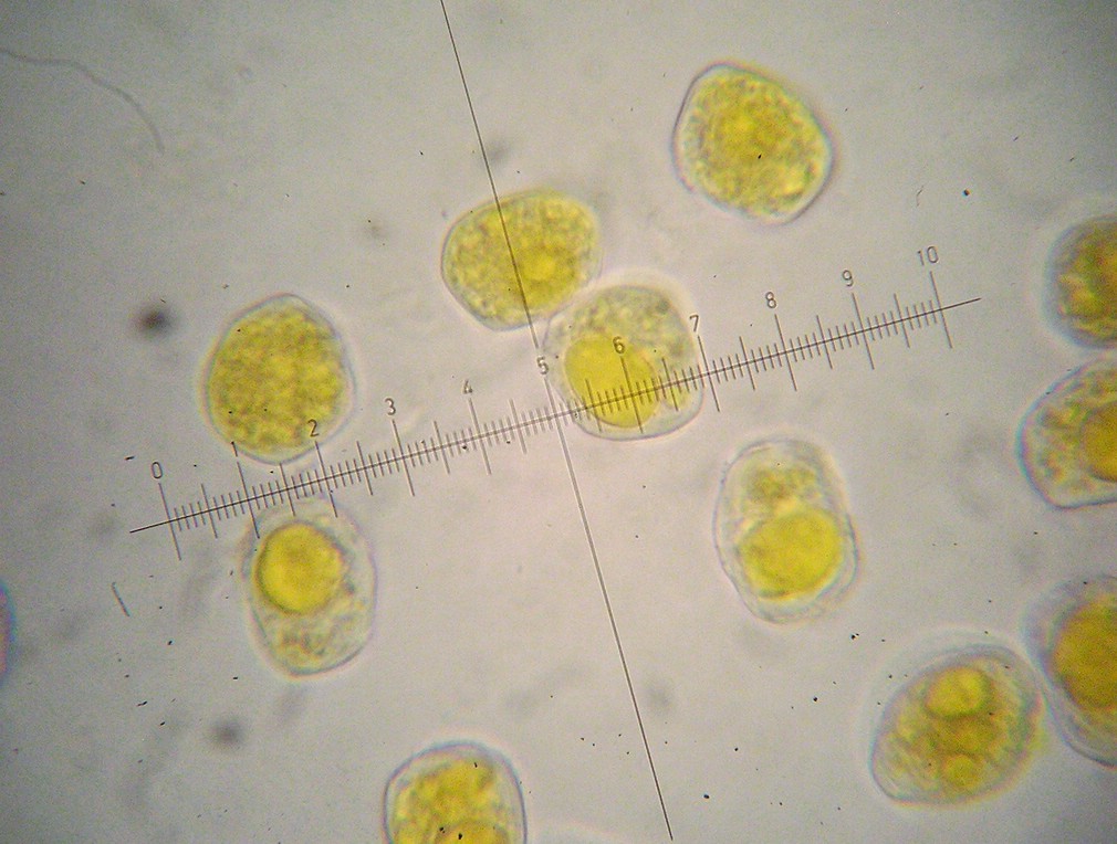 Aeziosporen stumpf polyedrisch, kugelig oder ellipsoid, in deutlichen Ketten (hier durch Druck getrennt)