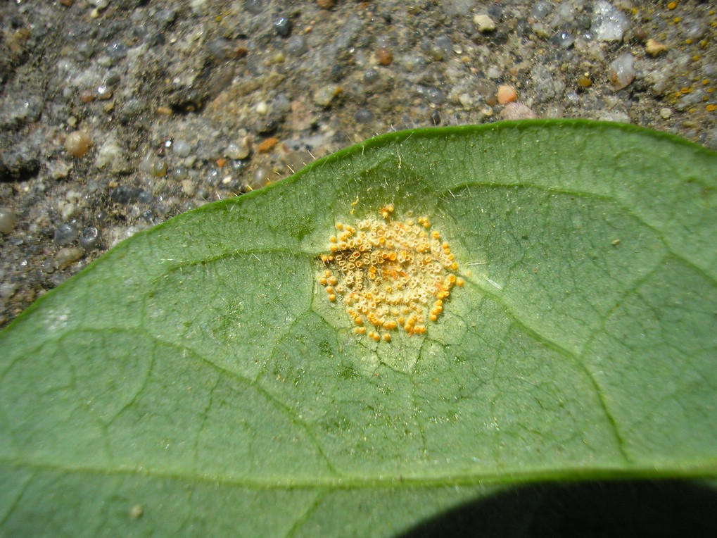 Aezien in meist kleinen ringförmig angeordneten Gruppen auf der Unterseite von kleinen runden, gelblichen Blattflecken