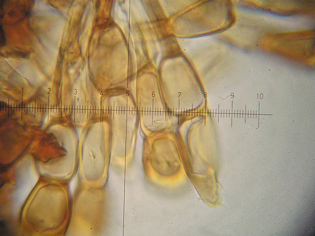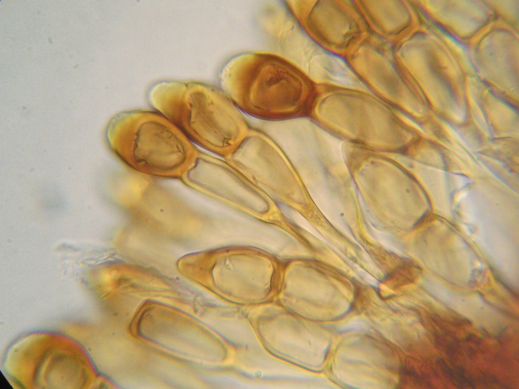 Teliosporen spindelig, untere Zelle meist doppelt so lang wie obere Zelle; am Scheitel lang ausgezogen (bis 10 µm)