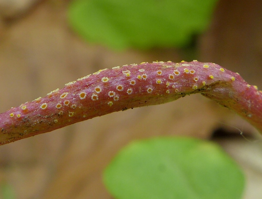 Uredien zerstreut, zimtbraun, oftmals ringförmig um ein größeres Lager angeordnet, früh nackt (=stäubend) und von einem weißen Hof umgeben