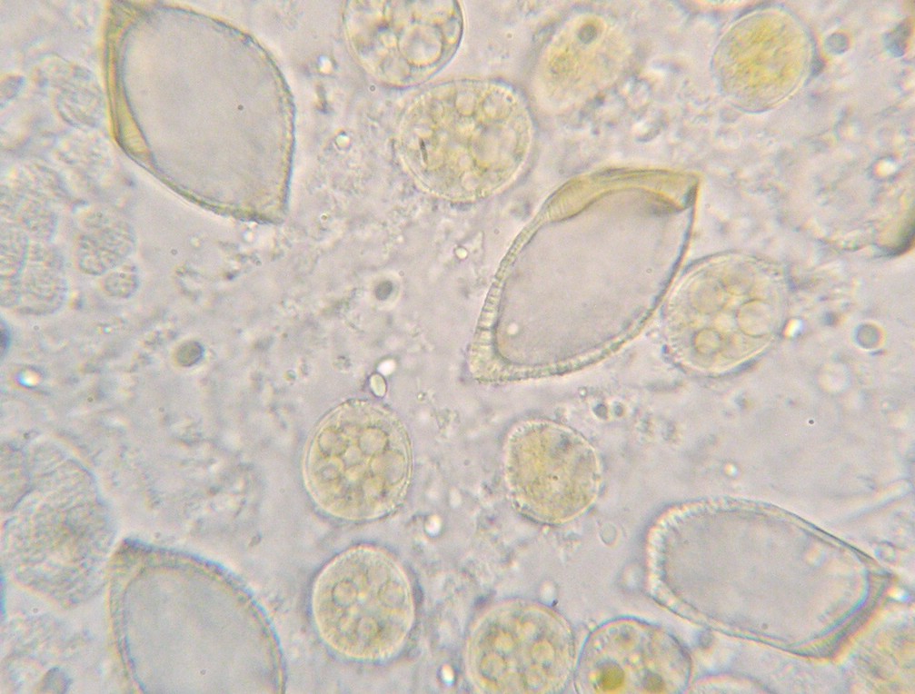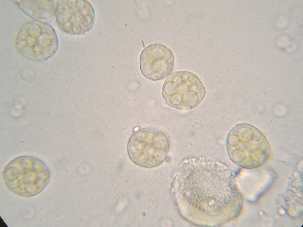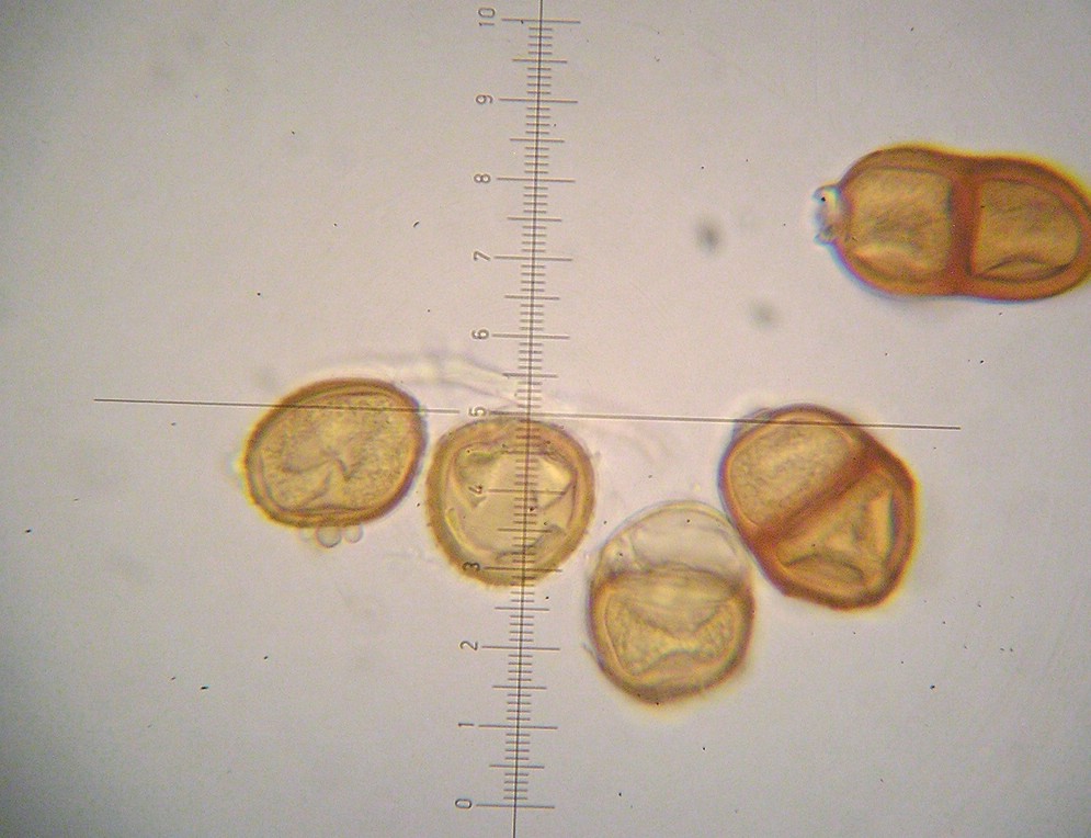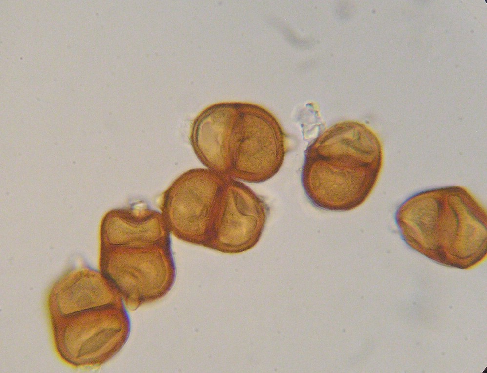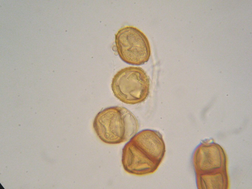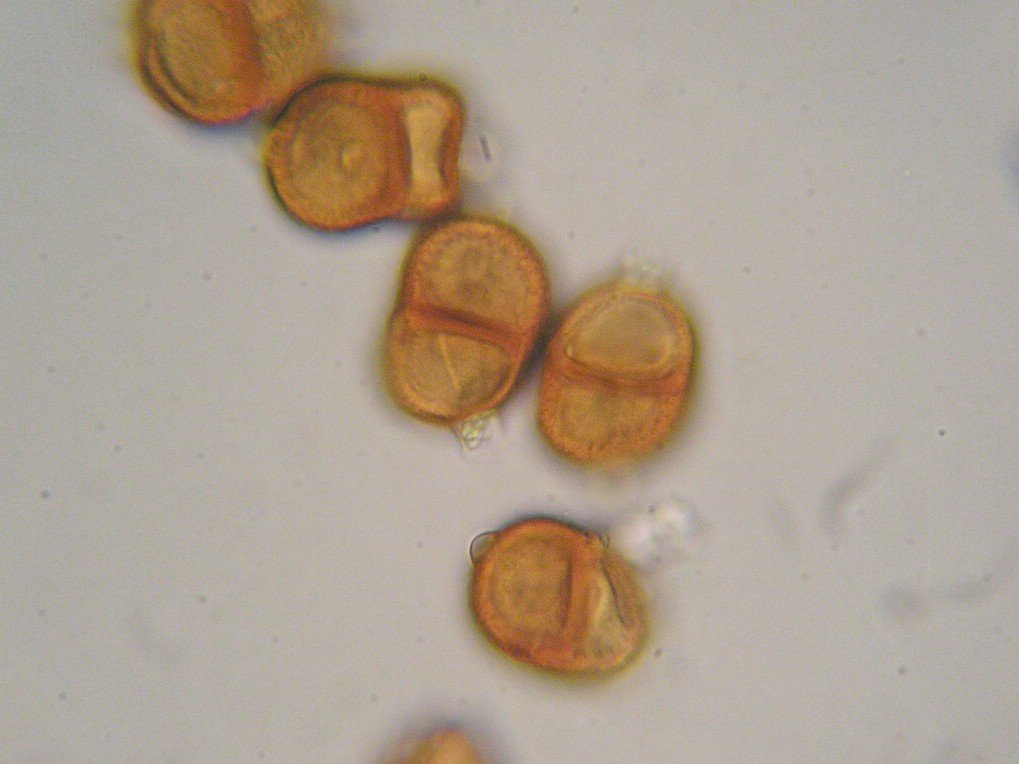 Aeciosporen kugelig bis abgeplattet, mit goldgelbem Inhalt, 19-20 x 17-20 µm