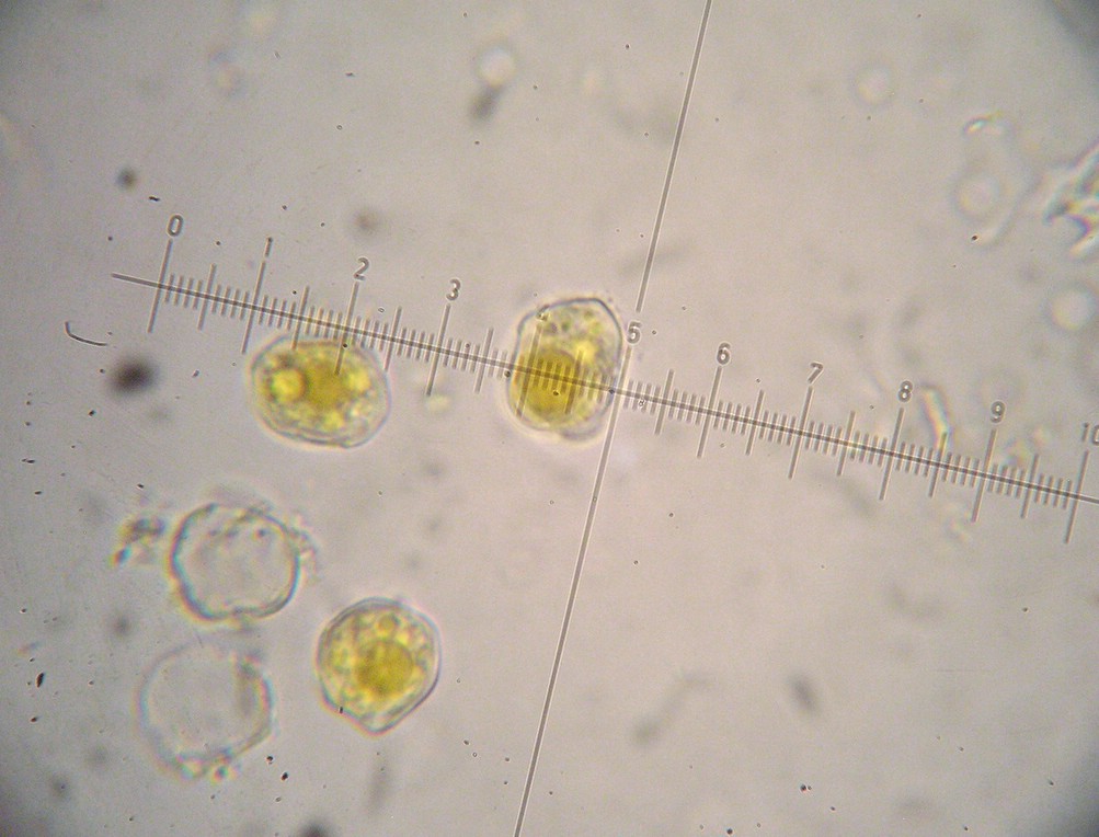 Aeciosporen in Ketten (hier durch Druck fast vollständig getrennt), kugelig bis polyedrisch, gelblich