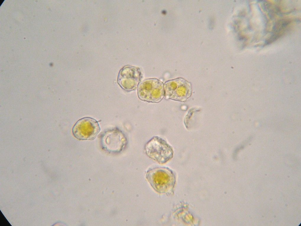 Aeciosporen in Ketten (hier durch Druck fast vollständig getrennt), kugelig bis polyedrisch, gelblich