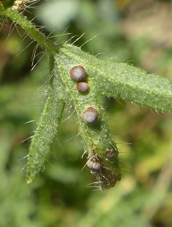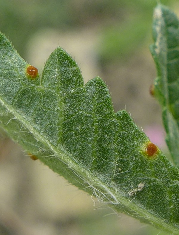 Telien auf der Unterseite von gelblichen bis bräunlichen, oftmals etwas eingesenkten Blattflecken (seltener auch oberseits)