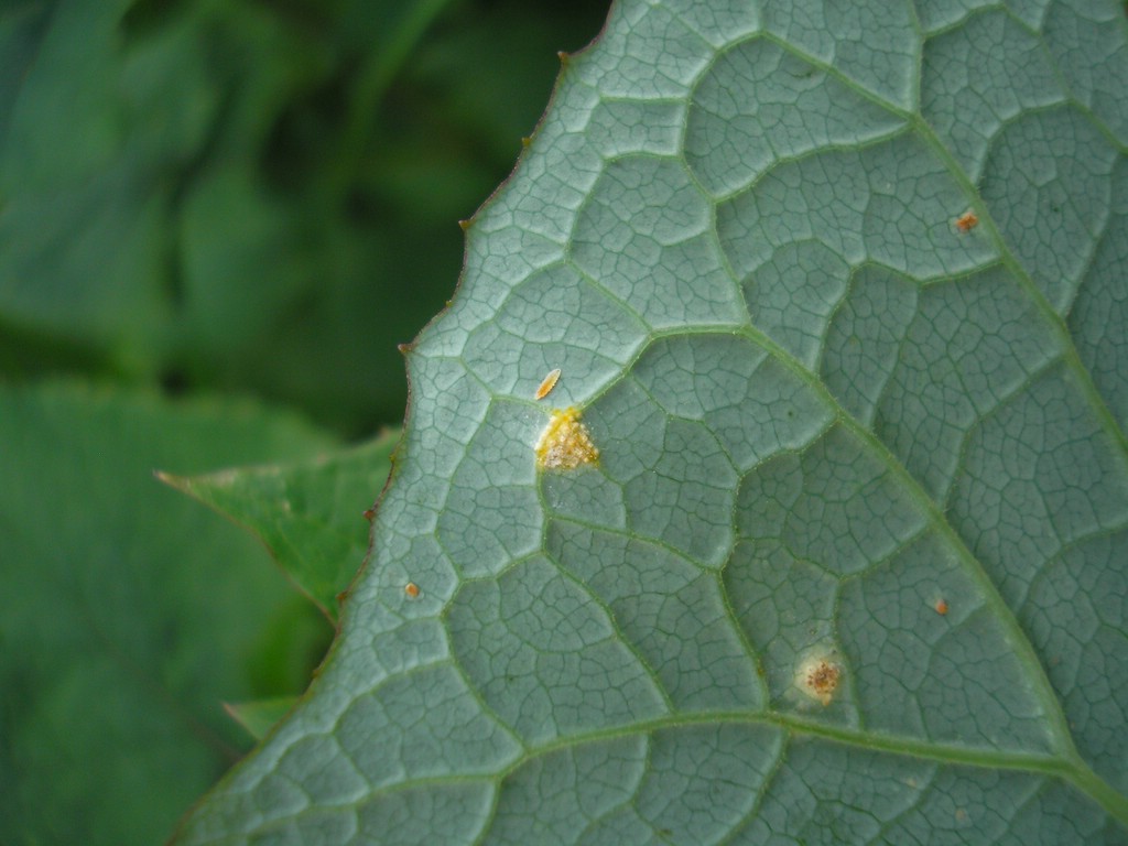 OLYMPUS DIGITAL CAMERAAezien in Gruppen, pustelförmig, gelblich-orange, auf der Blattunterseite