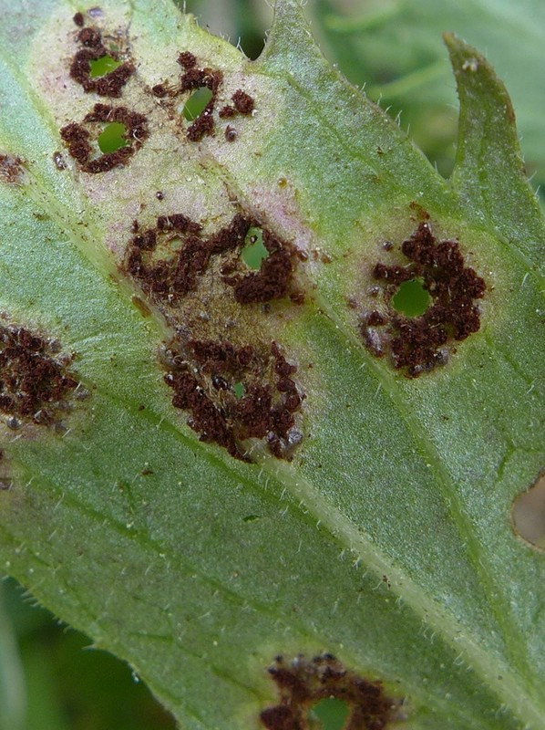 Telien dunkelbraun, in rundlichen Gruppen auf etwas erhabenen Blattflecken