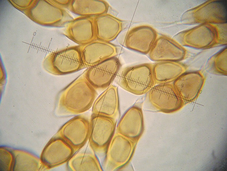 Teliosporen zweizellig, ellipsoid, Wand bis zu 2 µm dick, am Scheitel in eine hellere Spitze ausgezogen (bis 10 µm verdickt)