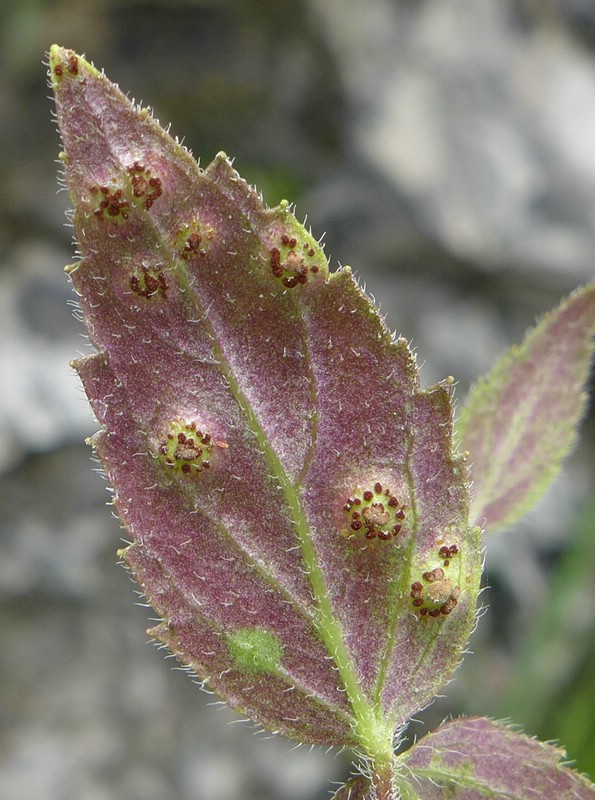 Telien dunkelbraun, in rundlichen Gruppen auf etwas erhabenen Blattflecken