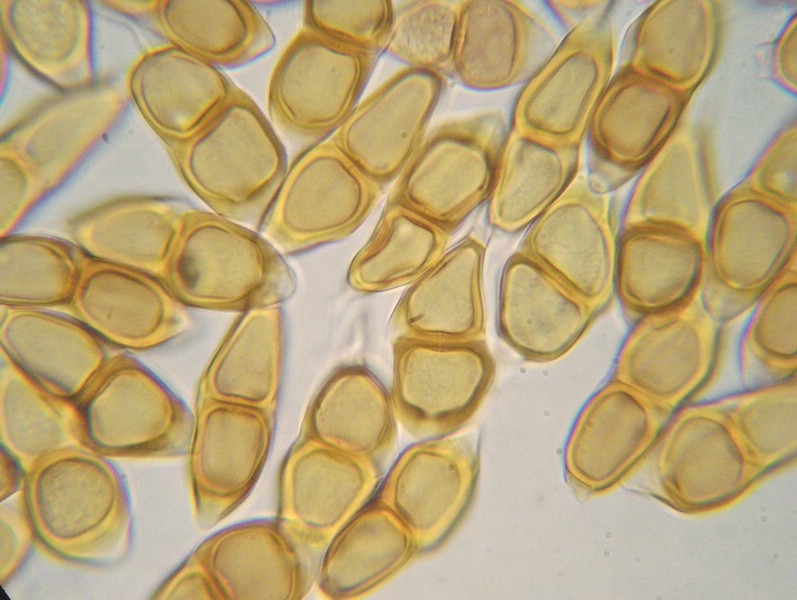Teliosporen zweizellig, ellipsoid, Wand bis zu 2 µm dick, am Scheitel in eine hellere Spitze ausgezogen (bis 10 µm verdickt)
