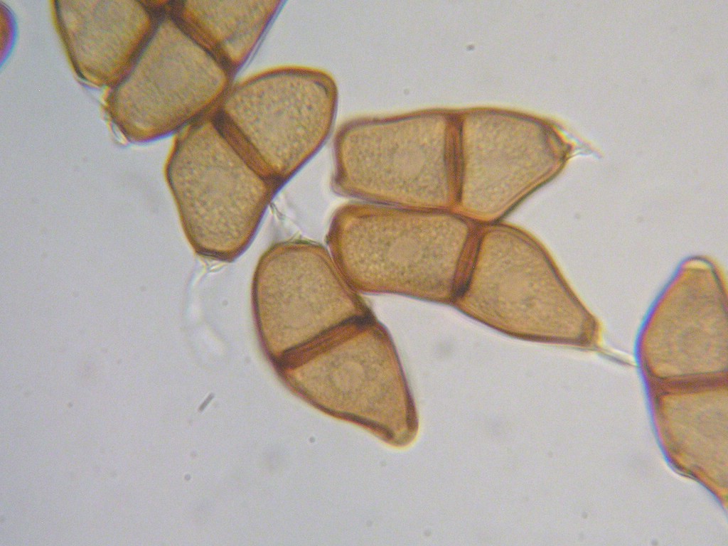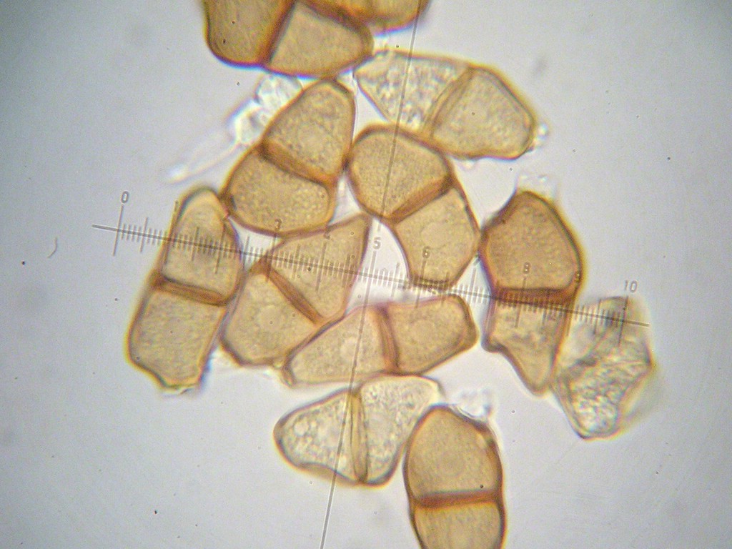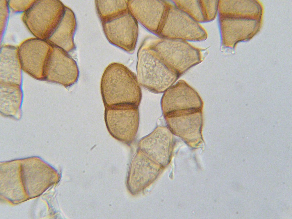 Puccinia pozziiTeliosporen zweizellig, verkehrt eiförmig bis ellipsoid, an der Grenze beider Zellen eingeschnürt