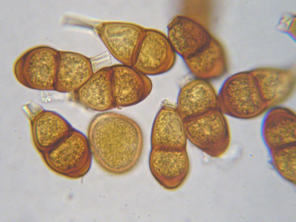 Uredosporen kugelig bis elliptisch, Keimporen mit flachen Kappen besetzt