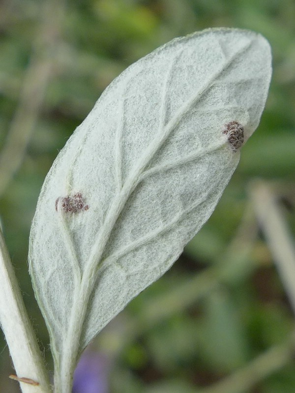 Telien im weißen Filz der Blattunterseite gut versteckt
