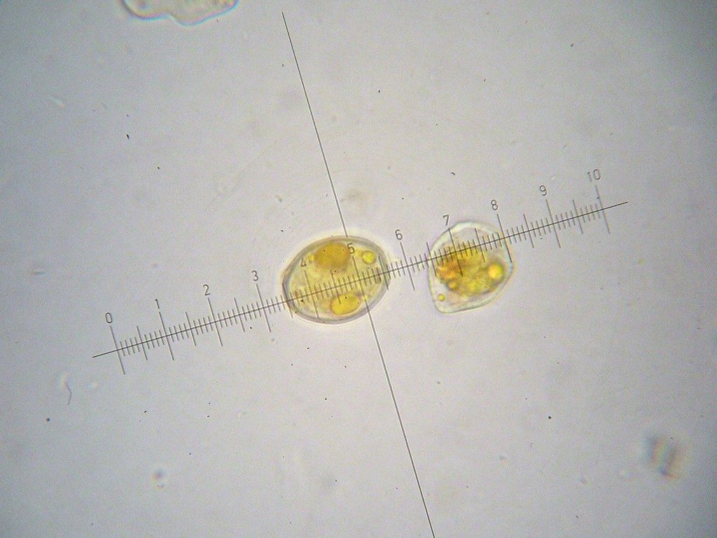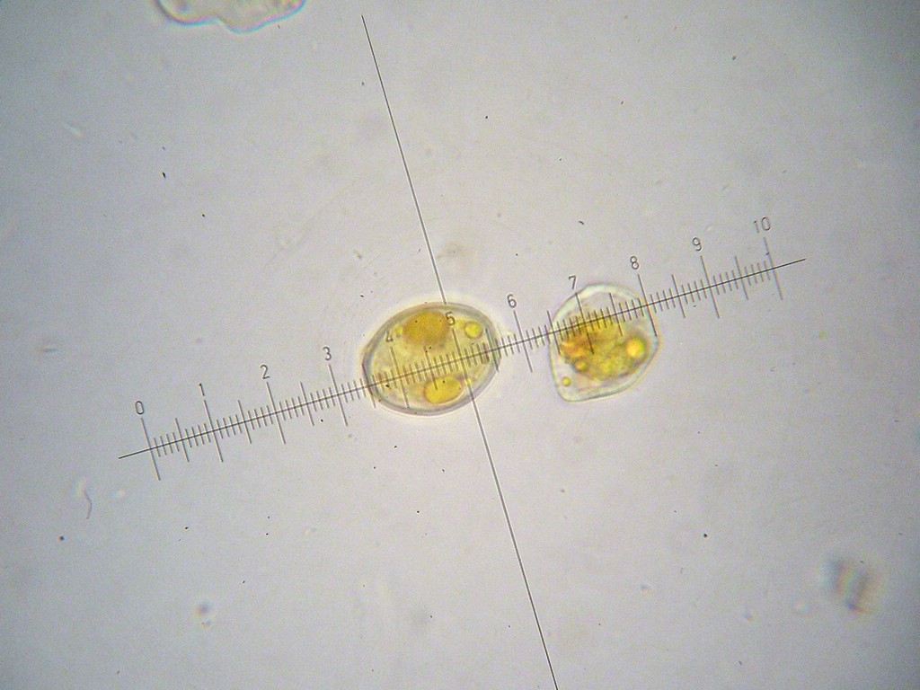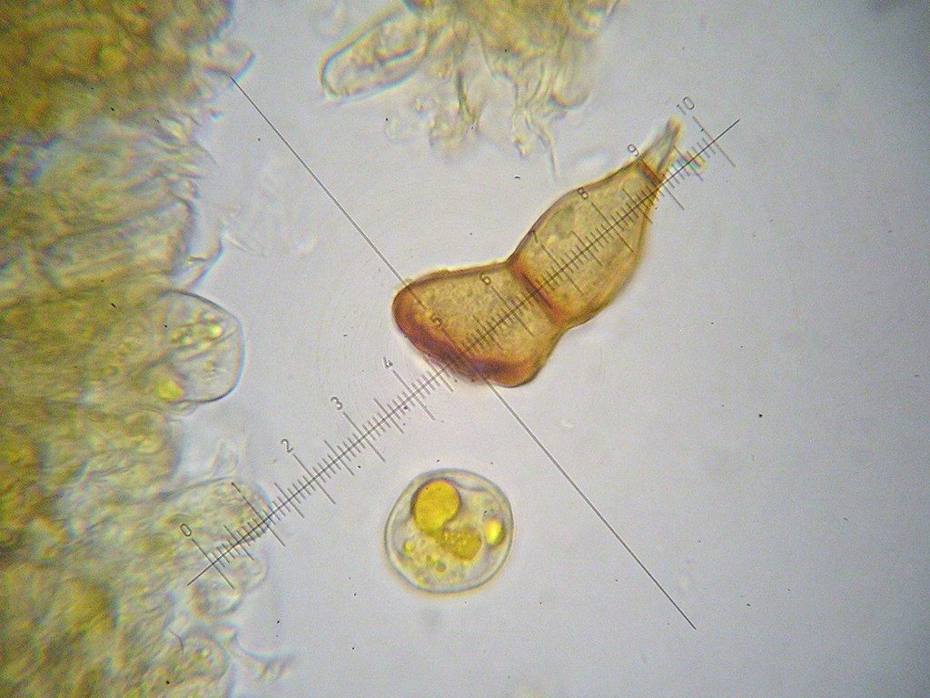 Uredosporen orange, breit ellipsoid, seltener kugelig; 20-21 x 16-18 µm
