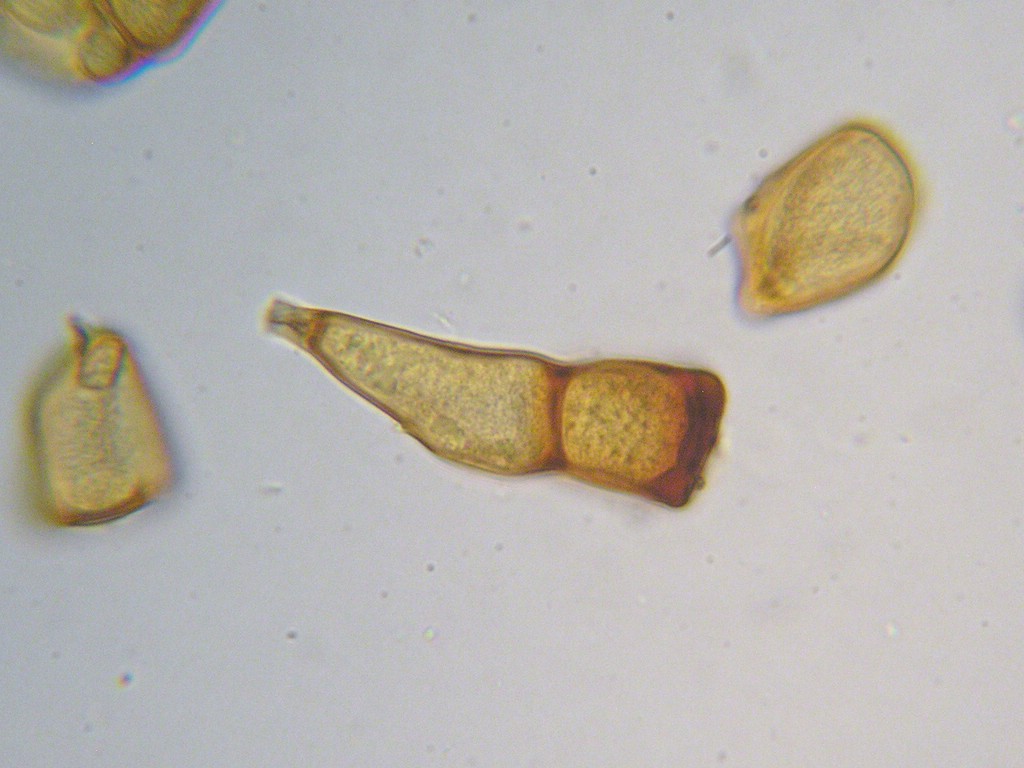 Teliosporen ohne Körnchen; am Scheitel aber oft schräg abgestutzt; untere Zelle schmäler und doppelt so lang wie obere Zelle