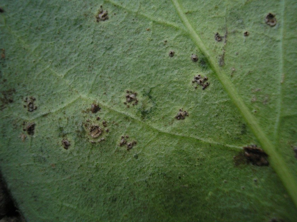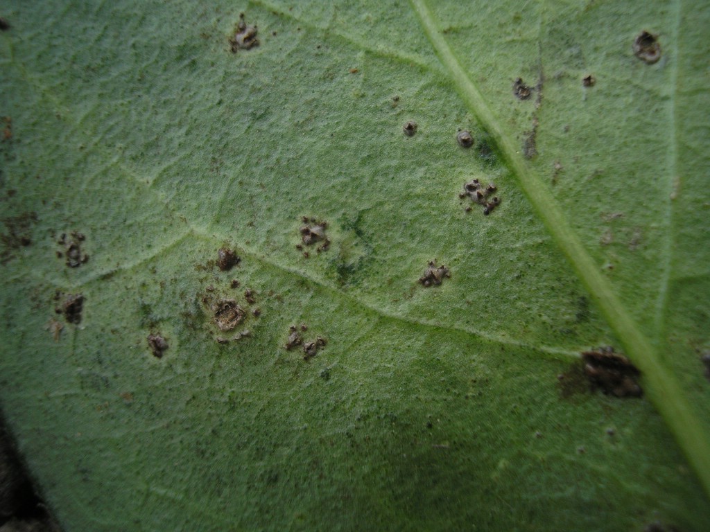 Pilzlager auf der Unterseite von gelben, rundlichen Blattflecken