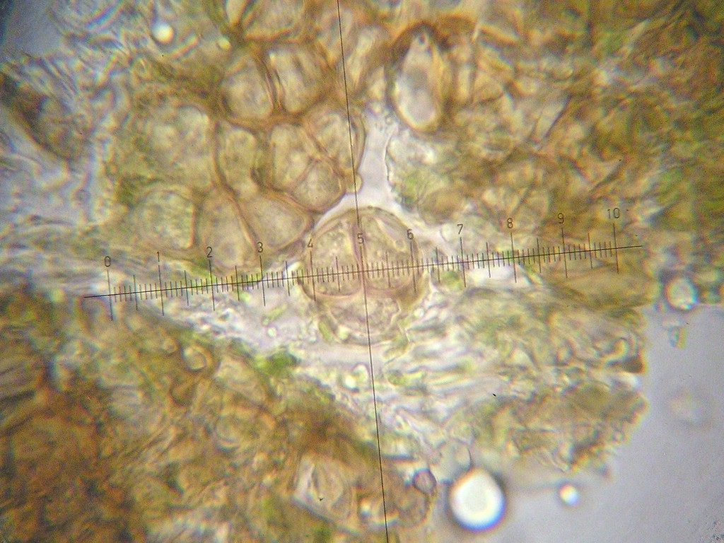 Uredosporen oval, seltener rundlich oder breit ellipsoid, schwach gelblich bis farblos (bleichen im Herbarbeleg aus); Uredosporen 17-20 x 10-12 µm