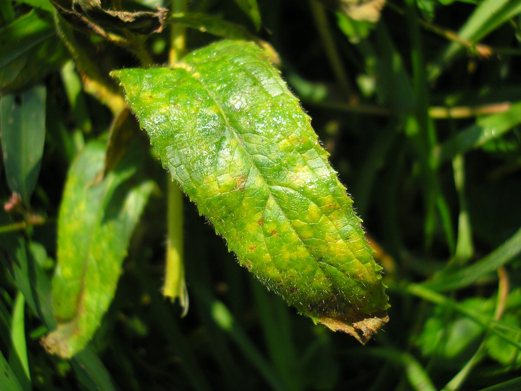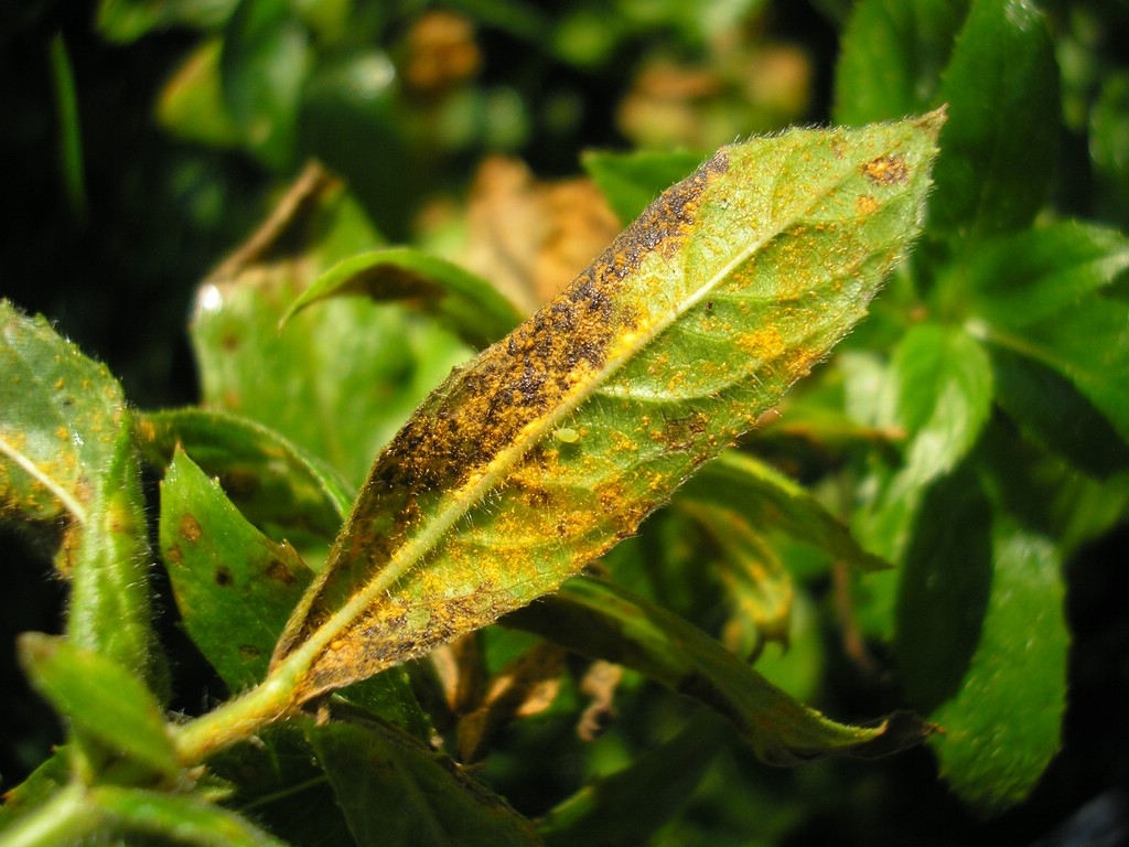Uredien auf der Unterseite von hellgrünen, gelblichen oder orangefarbenen Blattflecken