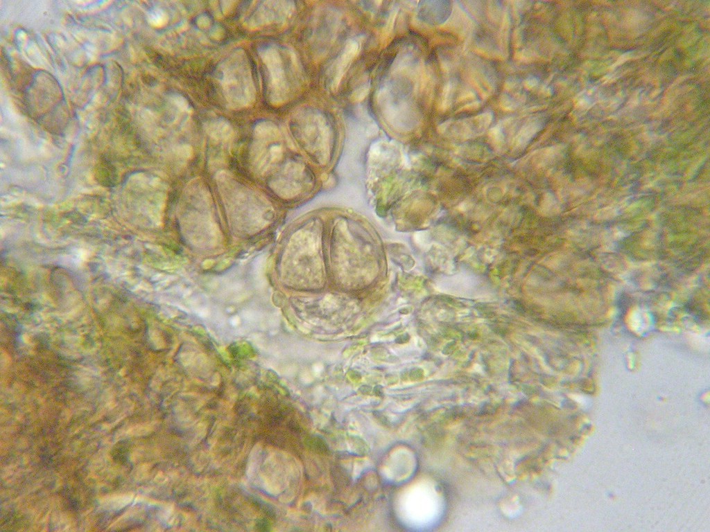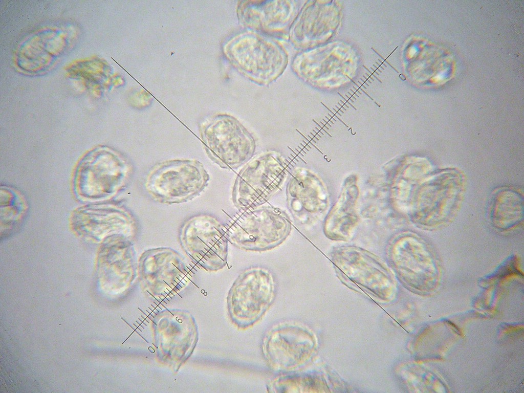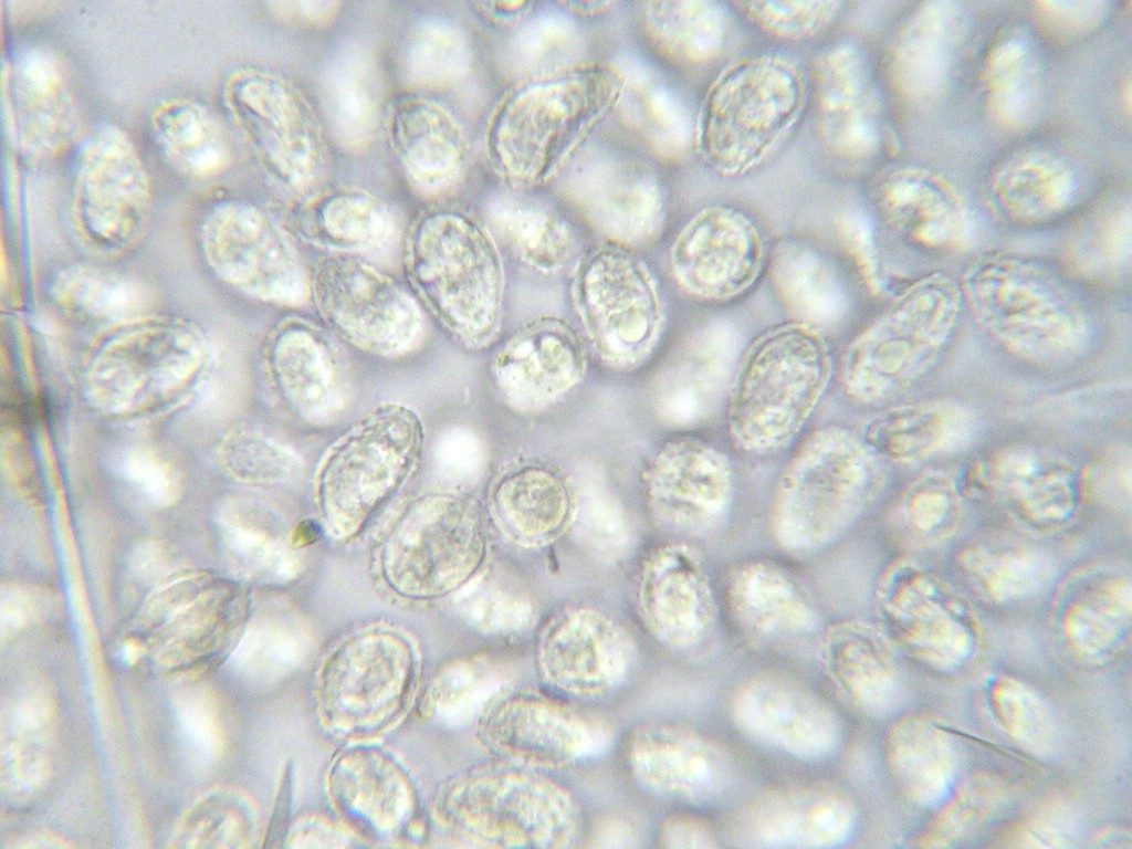Uredosporen oval, seltener rundlich oder breit ellipsoid, schwach gelblich bis farblos (bleichen im Herbarbeleg aus); Uredosporen 17-20 x 10-12 µm