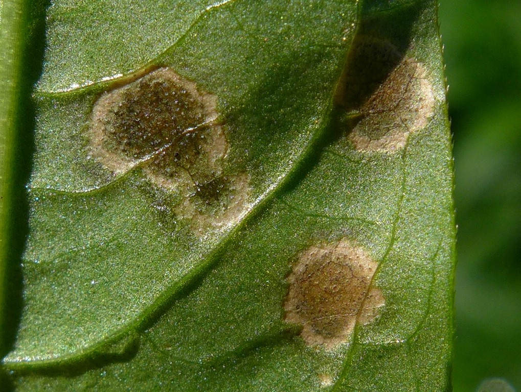 Blattflecken meist mit deutlicher dunkelroter oder dunkelvioletter Randzone („purpurrandig“)