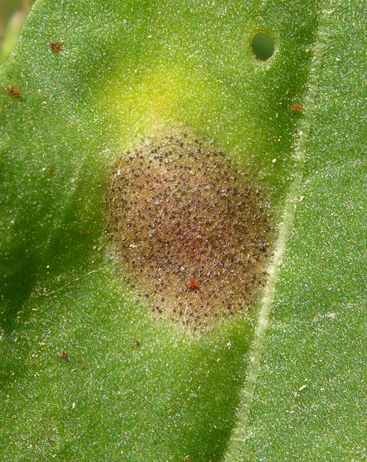 Blattflecken rostfarben, gelblich bis braun, dunkelrandig, 4–10 mm im Ø
