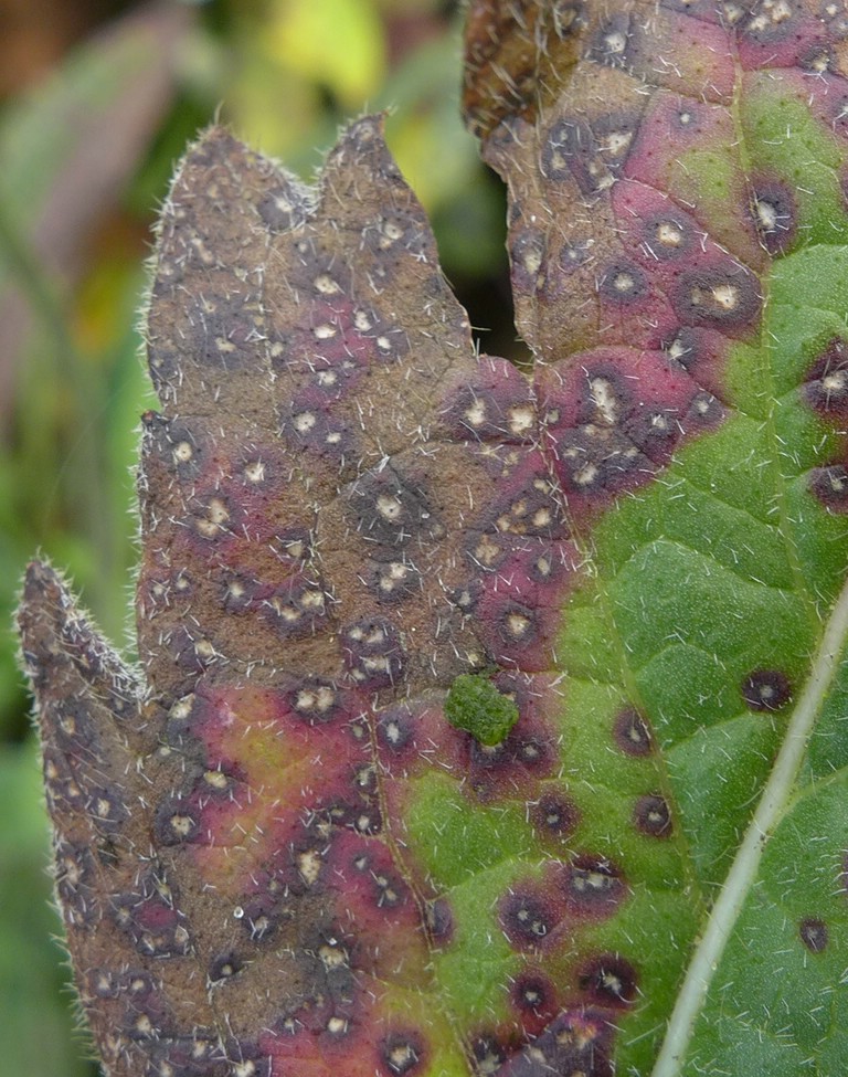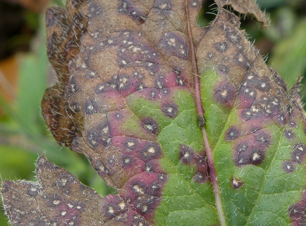 Blattflecken rundlich, dunkel bräunlich purpurn, blassrandig, später Mitte weißlich, z.T. ausfallend