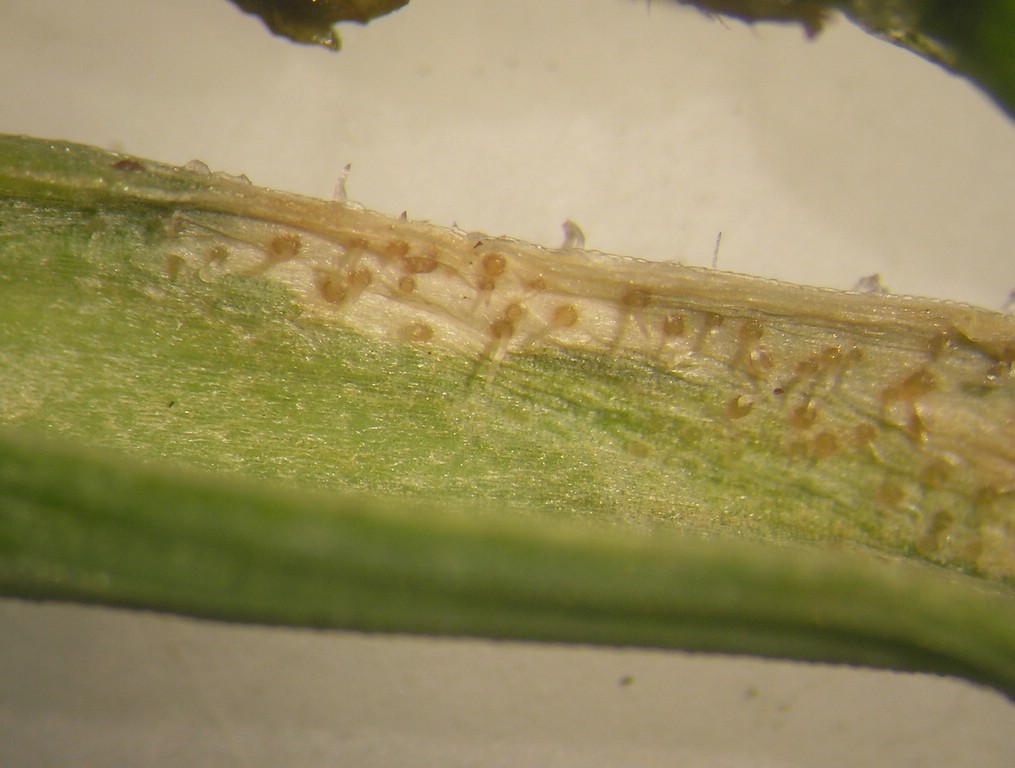 Pyknidien als ockerbraune Punkte beiderseits in den Flecken
