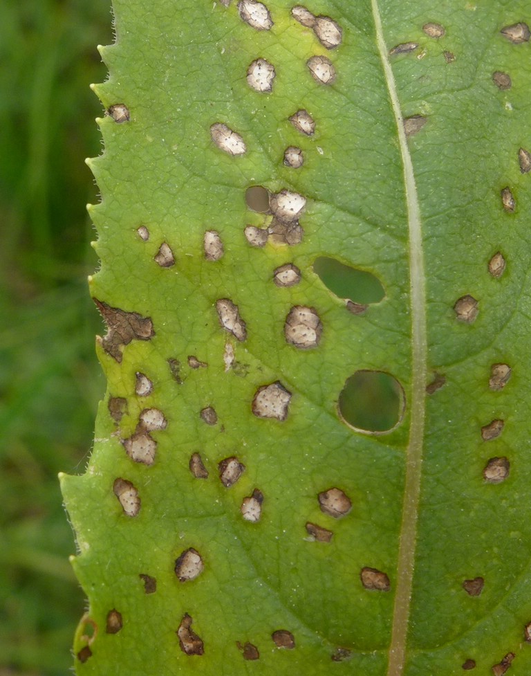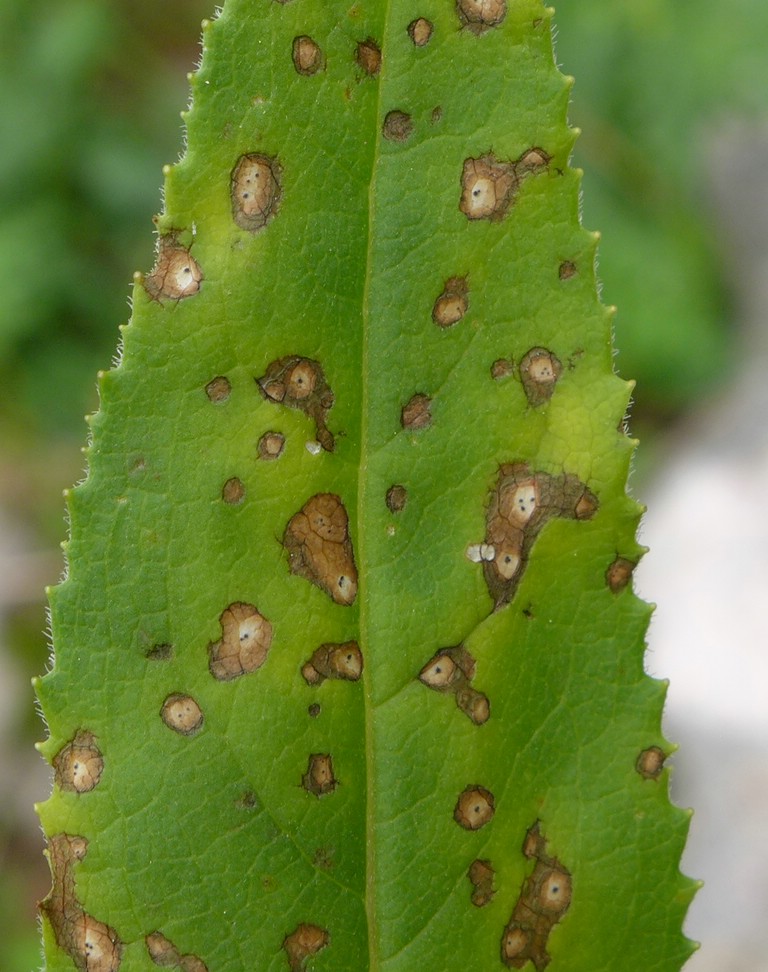 Blattflecken ocker-, leder-, olivbraun bis grauschwarz, später Mitte weißlich, 3–8 mm Ø