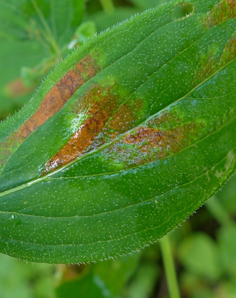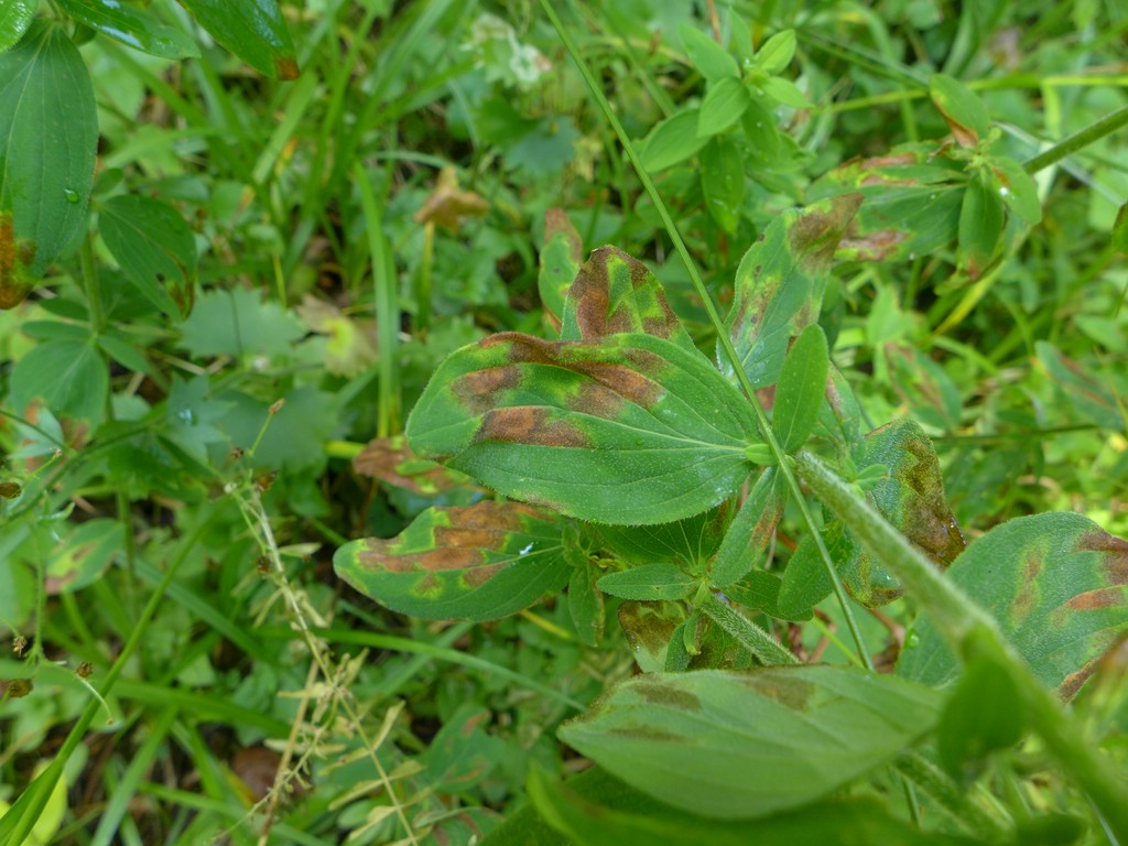 Blattflecken rostfarben bis braunschwarz, z.T. undeutlich, oft berandet, z.T. undeutlich, oft berandet, 2–5 mm Ø, oft stark ausgebreitet.