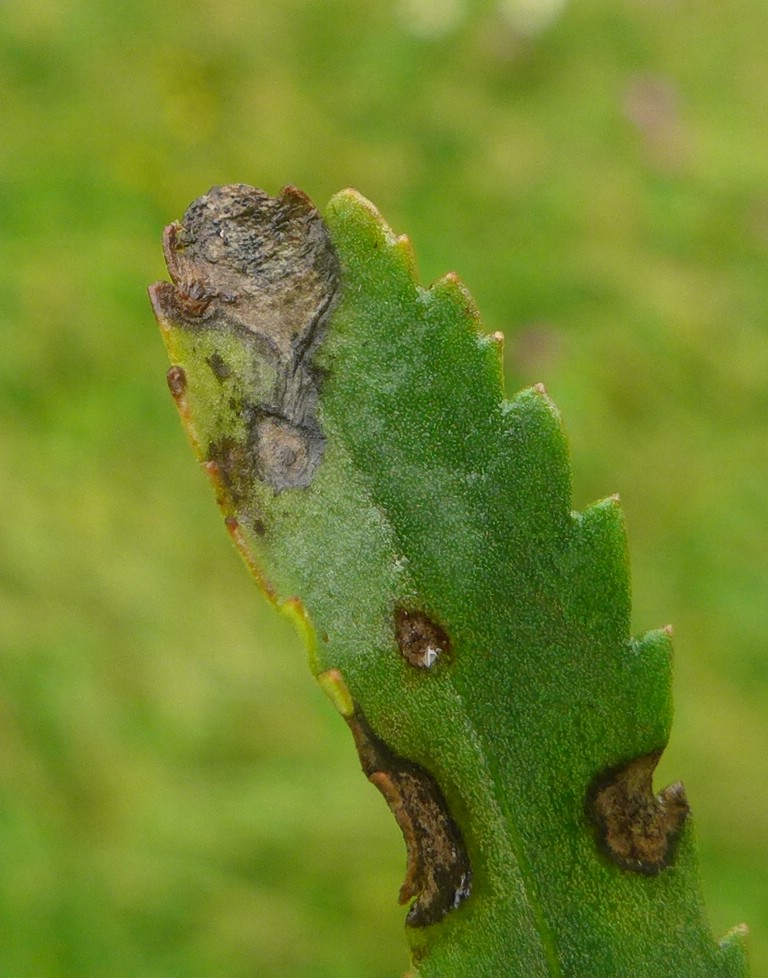 Pyknidien als kleine schwarzbraune Punkte oberseits in den Flecken