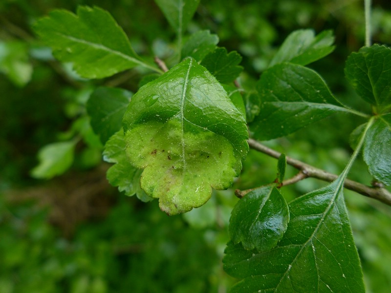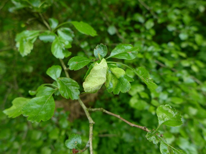 Vorsicht: Es gibt eine sehr ähnlich aussehende tierische Galle (Dysaphis crataegi) auf Weißdorn, die aber unterseits immer Reste von Blattläusen etc. aufweist