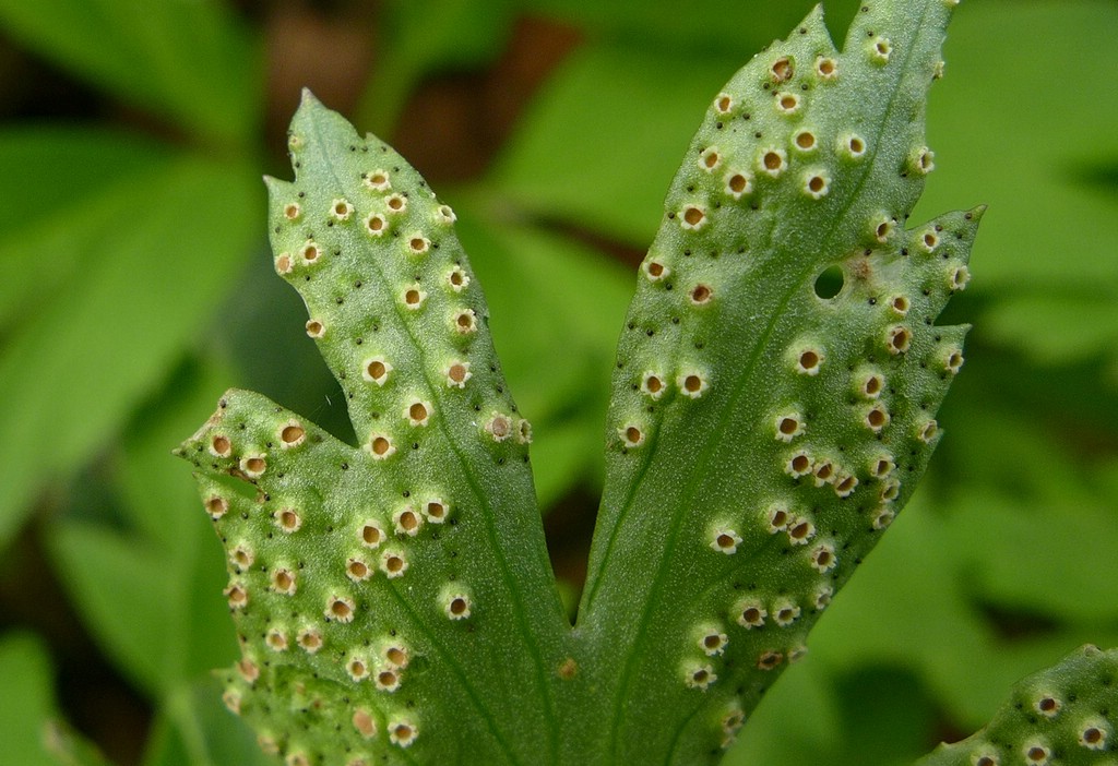 Spermogonien meist auf der Blattoberseite, klein, punktförmig, dunkelbraun, eingesenkt