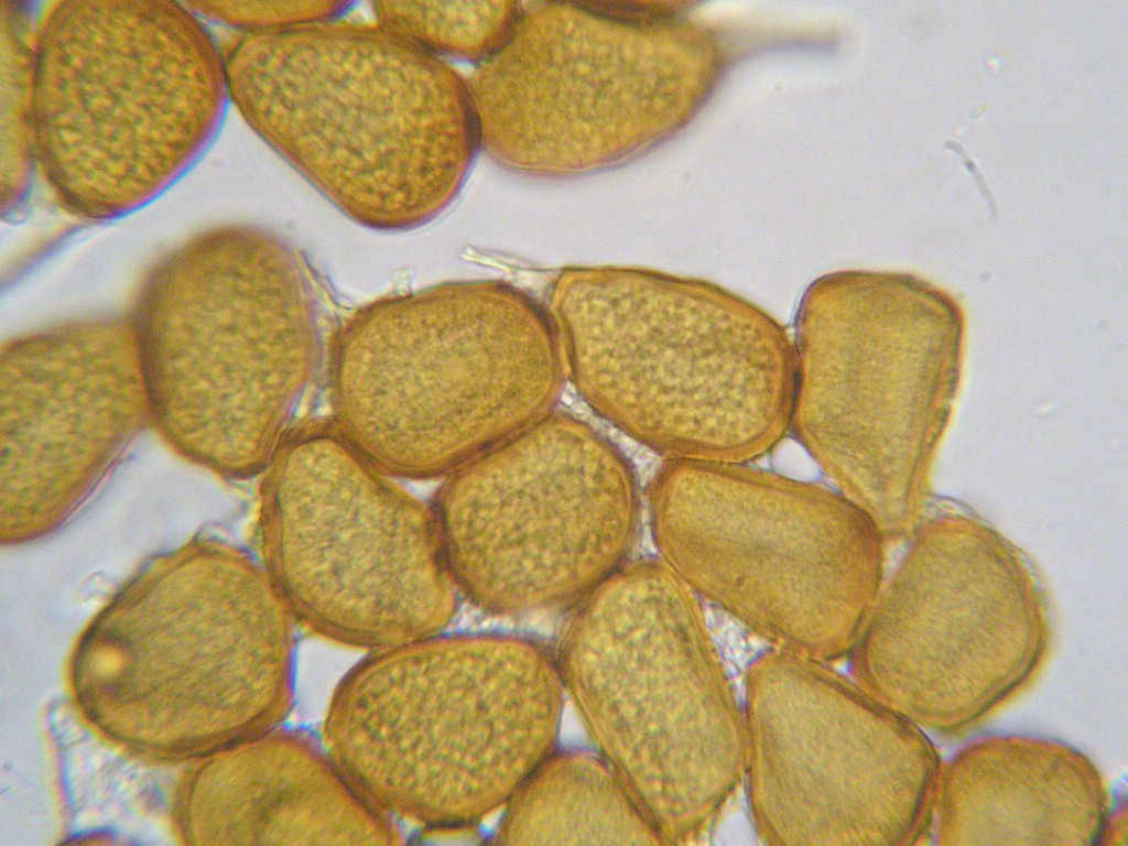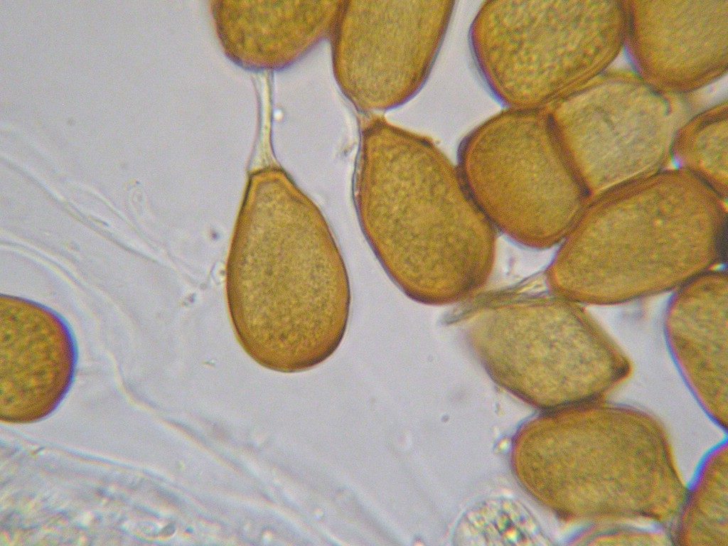 Teliosporen braun, meist einzellig, nur wenige zweizellige Sporen (rechts oben-mittig)