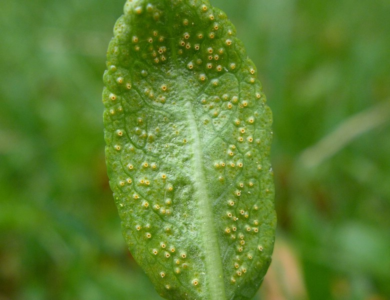 Uromyces caricis-sempervirentis_Phyteuma orbiculare_JKruse (4)Aecien becherförmig, zerstreut auf den Blättern
