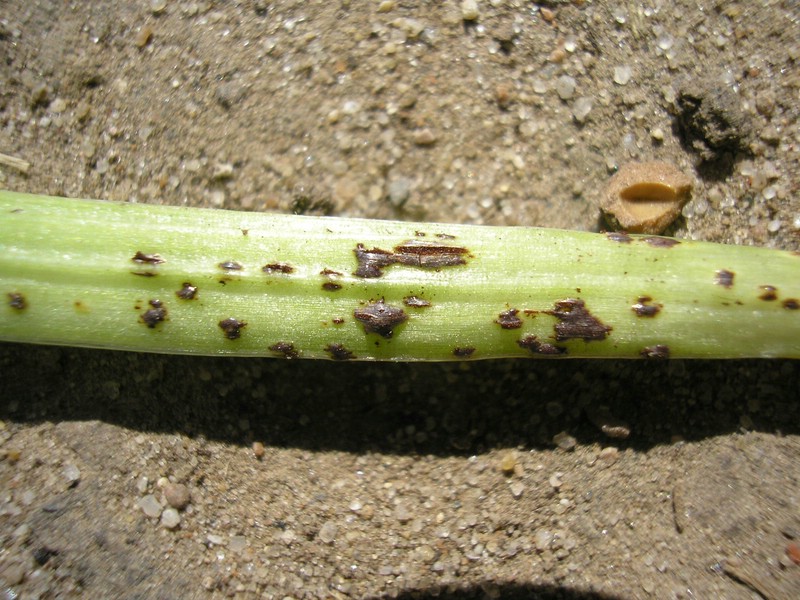 Die Telien sind dunkelbraun, blasig und von der Epidermis umgeben