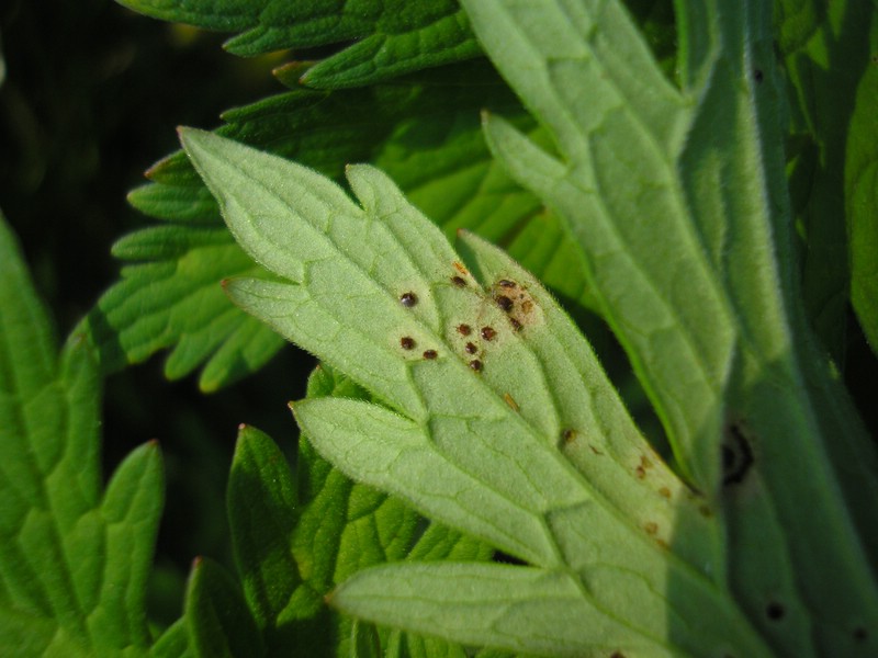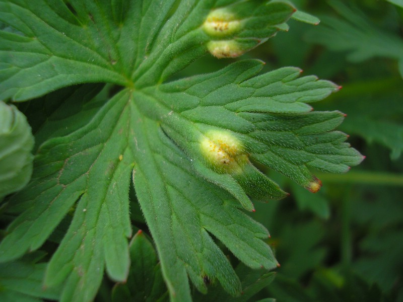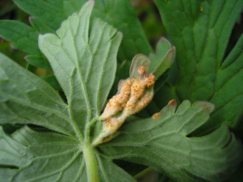 Bemerkung: Dieser Rostpilz vollführt keinen Wirtswechsel. Der Pilz bildet alle Stadien, Spermogonien, Aezien, Uredien und Telien auf Storchschnabel (Geranium) aus.
