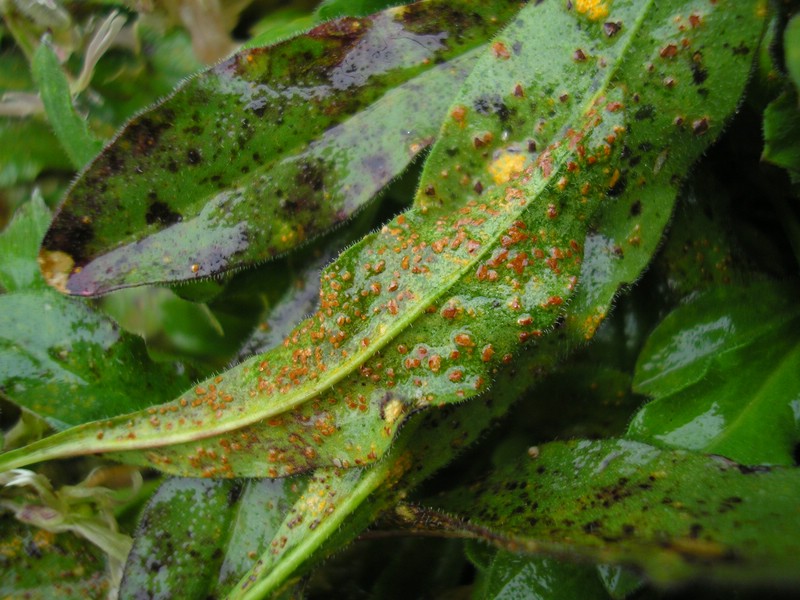 Uredien rundlich, zimtbraun und pulverig, meist an violetten Blattflecken