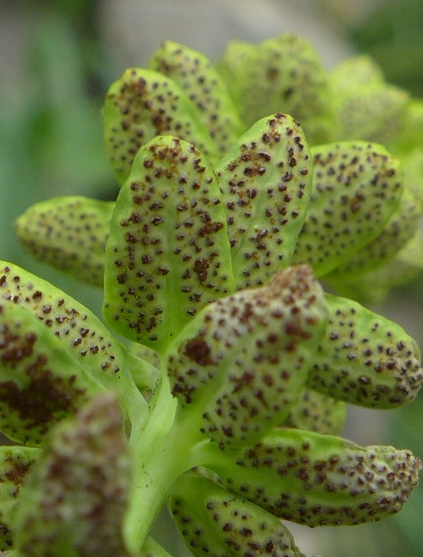 Telien auf der Unterseite von hellgrün oder gelblich gefärbten, meist verbreiterten Blättern